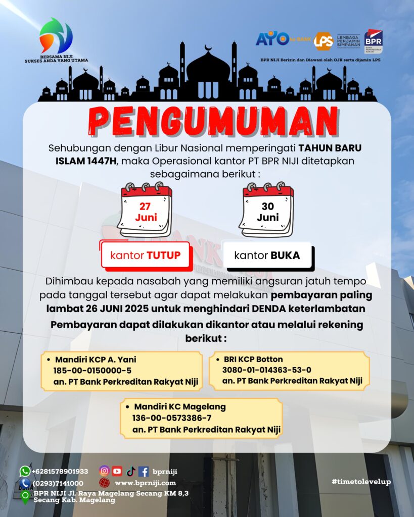 #bpr #bprniji #kredit #deposito #tabungan #tabunganumroh #finance #keuangan #bank #financialfreedom #financial #kreditcepat #kreditmobil #kreditrumah #tabunganhaji #tabunganpendidikan #nabung #uang #magelang #kreditmagelang #solusikeuangan #umkmindonesia #pinjaman #kreditmobilmurah #kreditmotor #tabunganpensiun #umkmnaikkelas #pinjamanuang #umkm